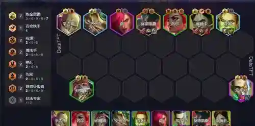 沙漠种族:螳螂和鳄鱼组成的2沙漠种族羁绊可以削减敌方队伍50%的护甲,让己方阵容更好地打出伤害,实现输出、斩杀目的。炼金师职业:炼金的专属职业羁绊,让炼金可以不被控制,持续对敌方进行剧毒控制并打出输出。