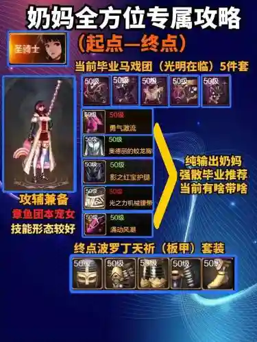 5、奶妈毕业装备搭配:武器选择:对于奶妈角色,武器方面优选选择带有勇气祝福属性的装备,如骑士和蓝龙。这两件武器对于提升奶妈的辅助能力非常有帮助。防具搭配:防具方面,推荐50级的守护套。这套防具不仅提供了良好的防御属性,还能进一步提升奶妈的辅助效果,是奶妈毕业装备的不二之选。