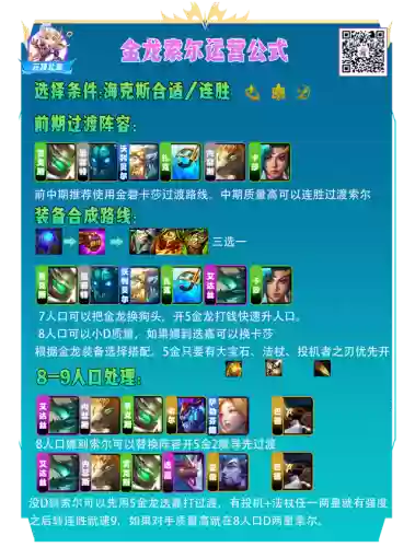 如果阵容额外法系装备较多,可以升9后变阵成4龙索尔。